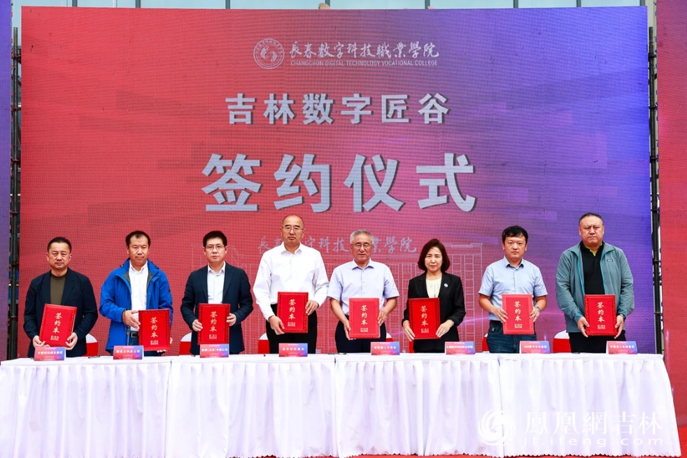 吉林省技能人才协会高级顾问姬国海、吉林省中华职教社副主任刘海、长春数字科技职业学院校长闻姝清、联想(北京)有限公司副总裁许辉、腾讯云科技有限公司生态总监丁剑飞、360数字安全科技集团有限公司副总裁张锦章、长春合心机械制造有限公司董事长胡天伟、长春市模具工业协会会长、长春恒拓模具有限公司董事长单伟东代表协会、职教社、院校、企业共同签署了《吉林数字匠谷建设协议》。